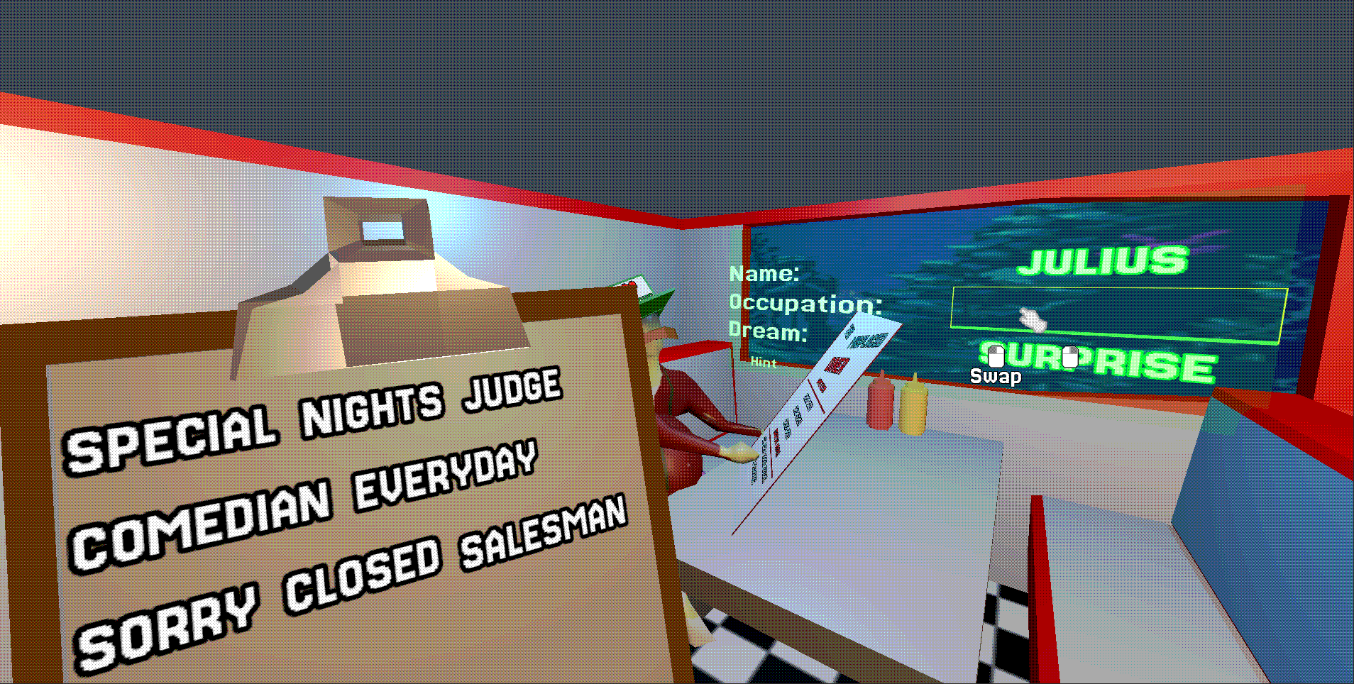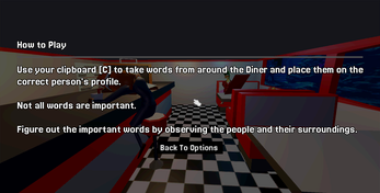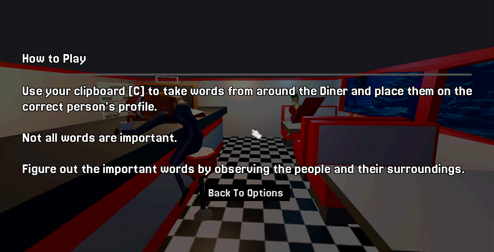 Deduce the Name, Occupation, and Dream of the People in the Diner using your surroundings. Fill out their profile by taking words from around the Diner and adding them to your clipboard. Inspired by games like Return of the Obra Dinn.